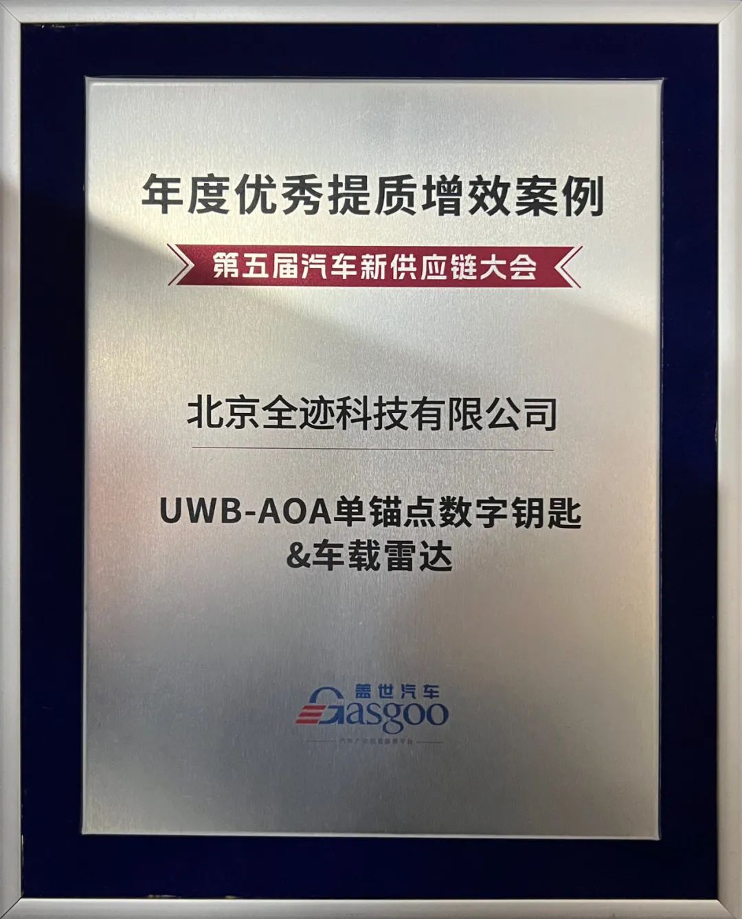 全跡科技UWB-AOA單錨點數字鑰匙&車載雷達獲評蓋世第五屆汽車新供應鏈大會“年度優秀提質增效案例”。