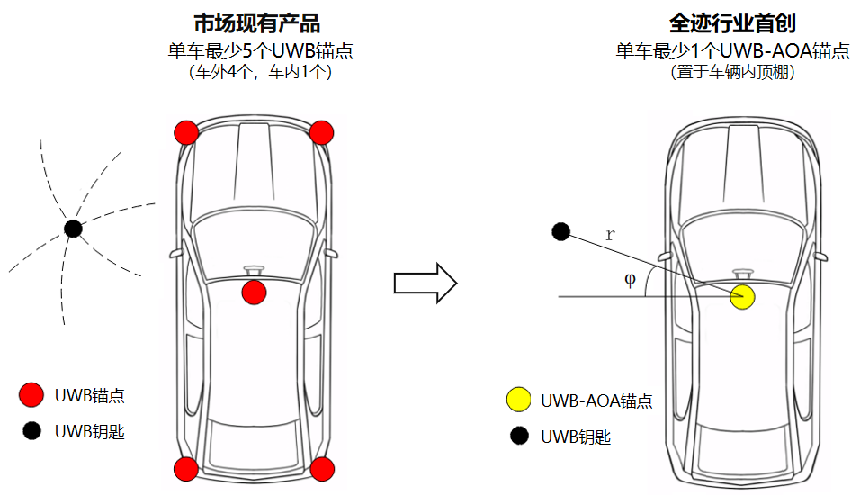 全跡科技基于天線陣列技術的UWB-AOA單錨點數字鑰匙系統,讓每輛車最少僅需1個UWB-AOA錨點即可實現傳統5錨點的同等功能。